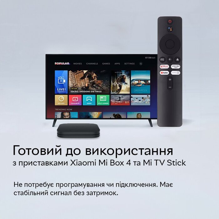 Цей пульт розроблений спеціально для зручного керування медіафункціями приставок Xiaomi. Завдяки підтримці голосових команд можна легко шукати контент, запускати програми або керувати відтворенням, просто вимовляючи команди. Bluetooth-з'єднання виключає необхідність спрямовувати пульт на пристрій, а ергономічний дизайн робить його зручним для повсякденного використання.