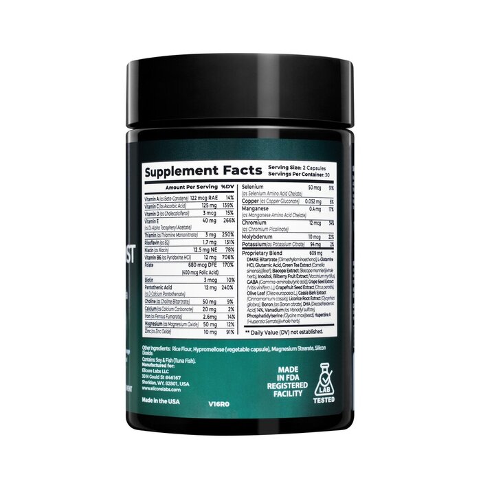 | ДМАЕ бітартрат, L-глутамін HCL, глутамінова кислота, екстракт зеленого чаю, екстракт бакопи, інозитол, екстракт плодів чорниці, ГАМК, екстракт виноградних кісточок, екстракт насіння грейпфрута, лист оливи, екстракт кори касії, екстракт кореня солодки, бор гуперзин А | |