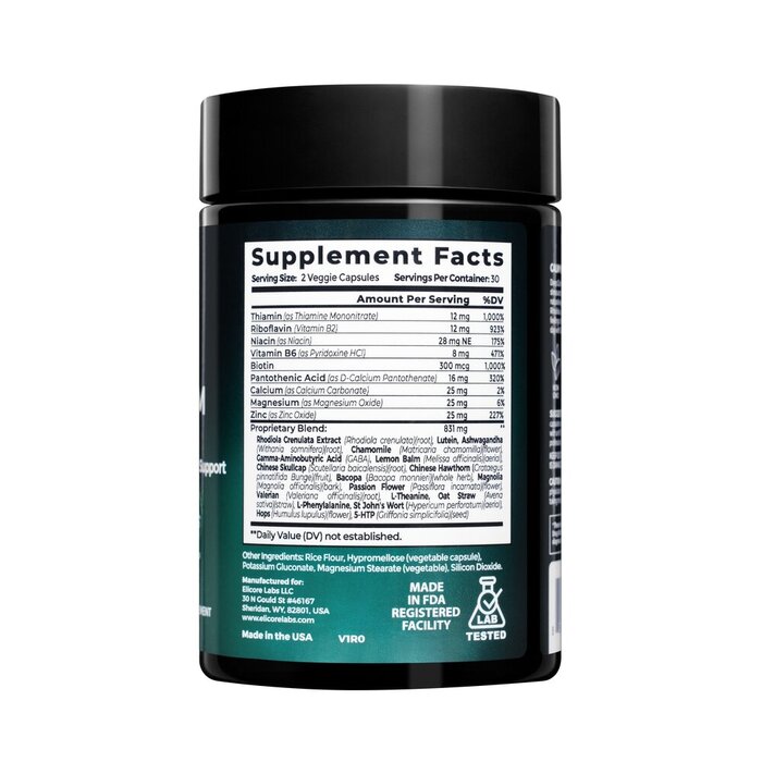 | екстракт родіоли, лютеїн, ашваганда, ромашка, ГАМК, меліса, шоломник байкальський, глід, бакопа, магнолія, пасифлора, валеріана, L-теанін, солома вівса, L-фенілаланін, звіробій, хміль, 5-HTP | |